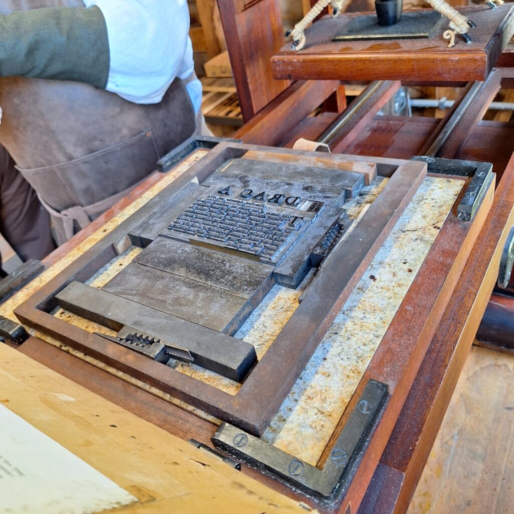Ink for printing is nothing like ink you dip a quill into! It consists of linseed oil, boiled down to a thick paste, with some other ingredients, and colored with soot. Since it takes a full day to dry, we wouldn’t hand out fresh prints.